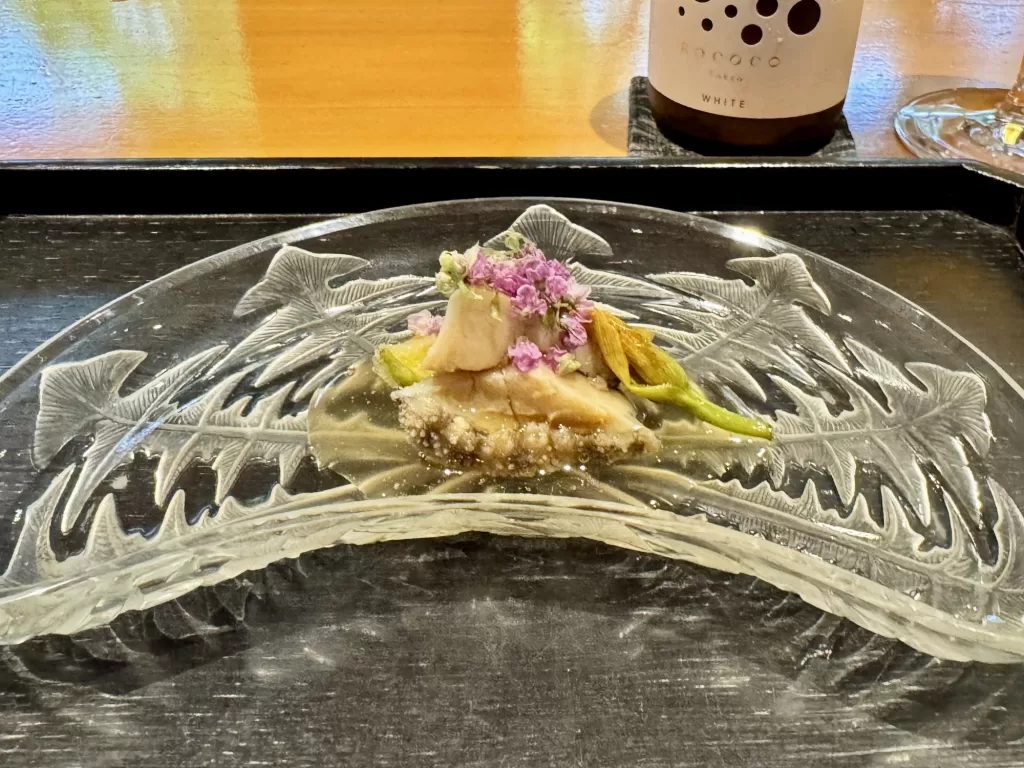 蒸しアワビと佐賀産いちじくの天婦羅 甘酢と土佐酢の冷たい餡がけ