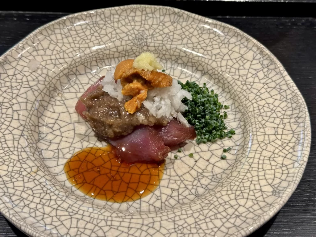 マグロ(無農薬の藁でスモーク)に自家製なれ、赤紫蘇の香り付け 大根・アサツキ・雲丹・生姜添え