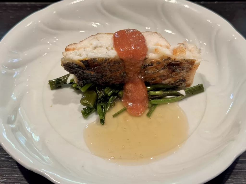 平鱸のトマト醤油麹焼き 空心菜の炭焼き添え