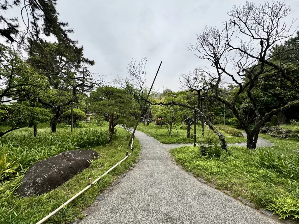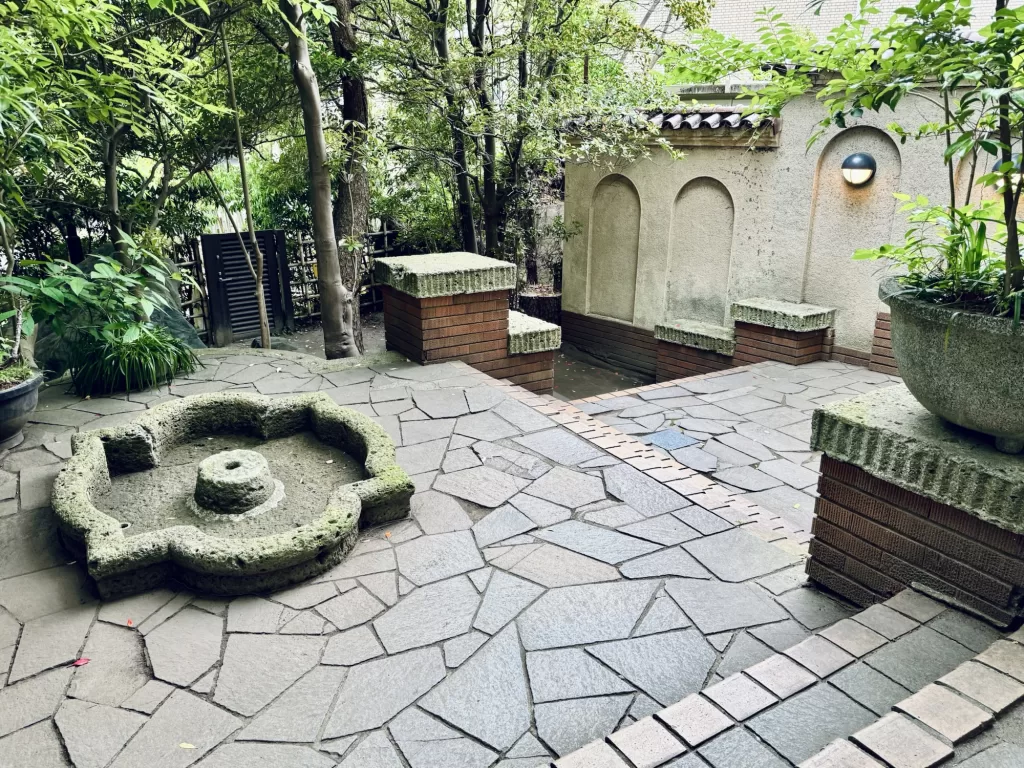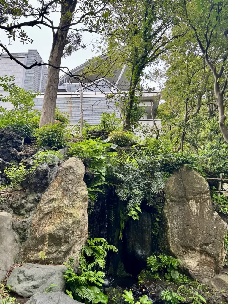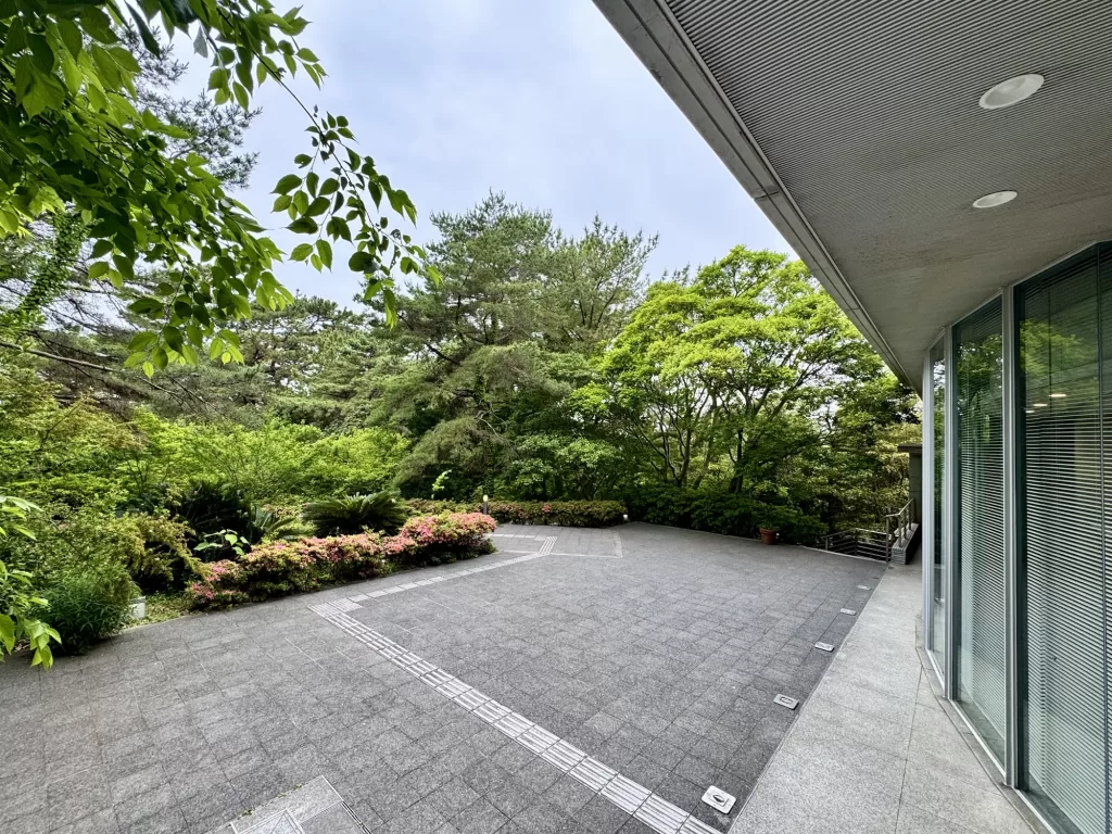 この地にはかつて松籟荘という洋館が立っていた。昭和初期のスペイン風の別荘は諸事情であいにく取り壊されてしまったが、タイルや敷石、噴水などの遺構が残っており、美術館の敷地から当時の南ヨーロッパ風の近代別荘建築を伝えている。