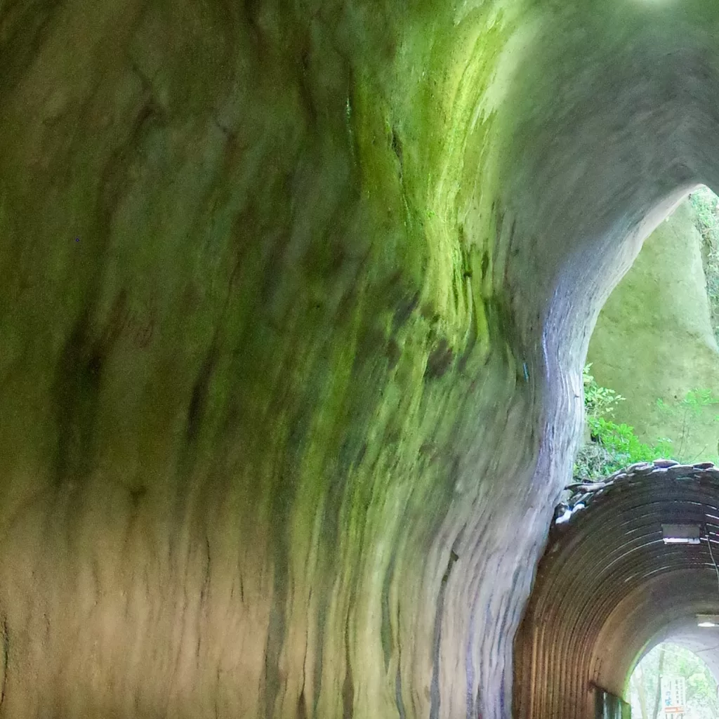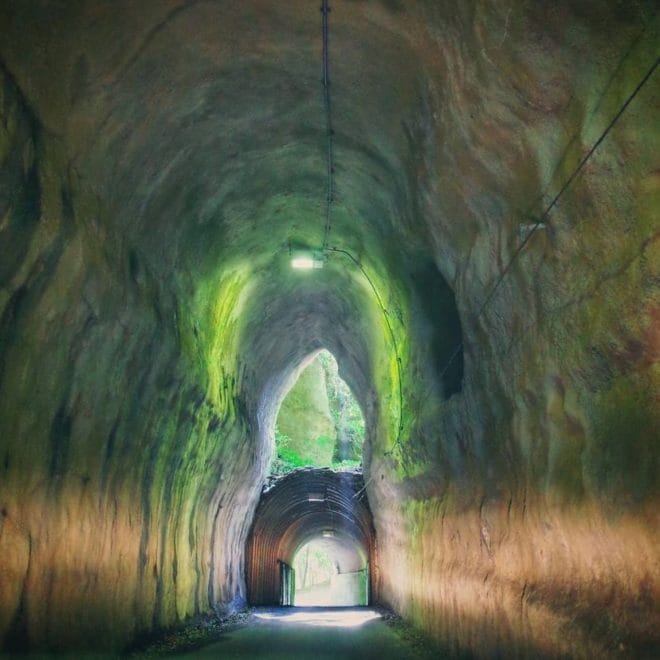 ひとつは明治期に、もうひとつは昭和期に掘られたとされるこのトンネル群は、手掘りの岩肌がそのまま残された素掘り構造。昼間でも中は薄暗く現実から切り離されたような感覚を覚える。人工物でありながら自然の一部に溶け込んでいるようでもある。特にトンネルの向こうに差し込む一筋の光と、足元に反射する湿った石の質感が幻想的で美しい。
