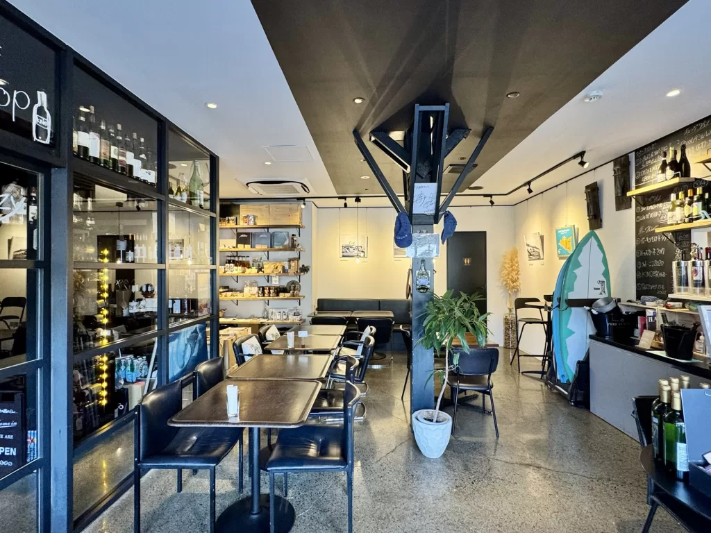 江ノ電「腰越駅」の目の前、徒歩2分でビーチ、4分でサーフィンにぴったりの海がある、まさに理想的なロケーション。今回はワインショップを併設するカフェバー「KINO WINE SHOP & CAFE DININIG」を訪れる。