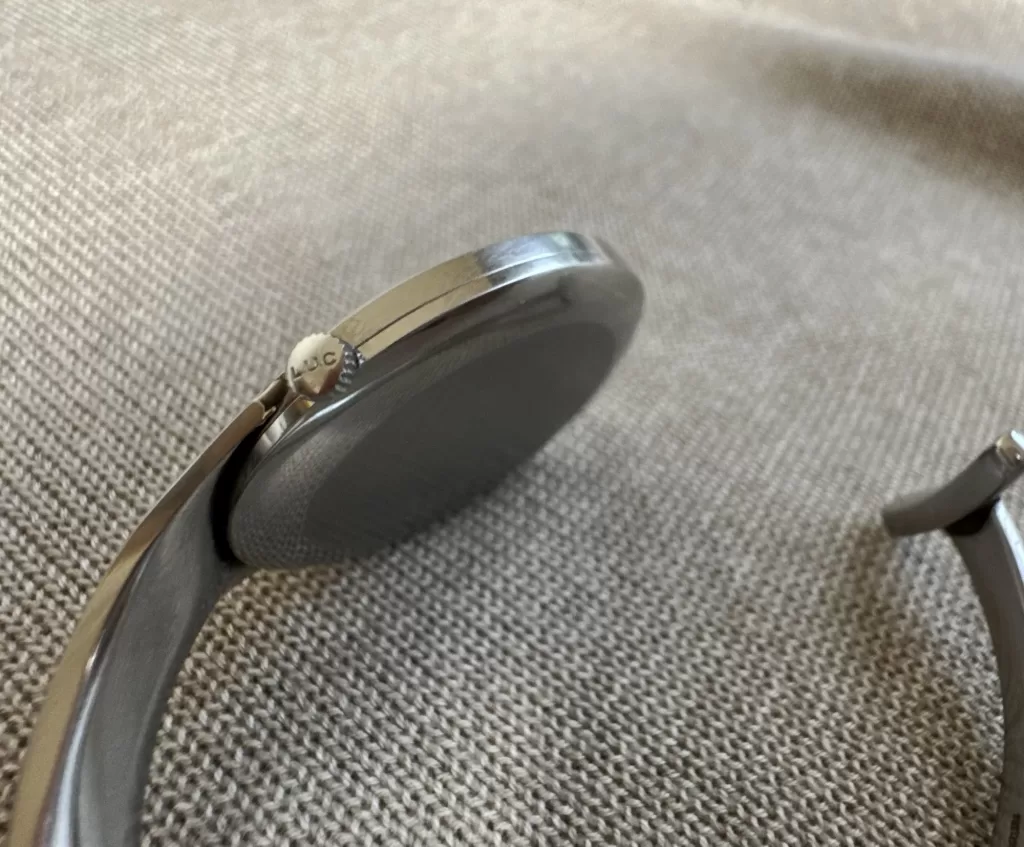 今回の時計の個体は、1967年頃の製作とされるショパール製のL.U.C.手巻きムーブメント(機械)を搭載したファーストモデルにあたります。時を刻む機構が電池式ではなくゼンマイ仕掛けで、竜頭を巻き上げることで時計の針と歯車を動かす仕組みになっているのが特徴です。