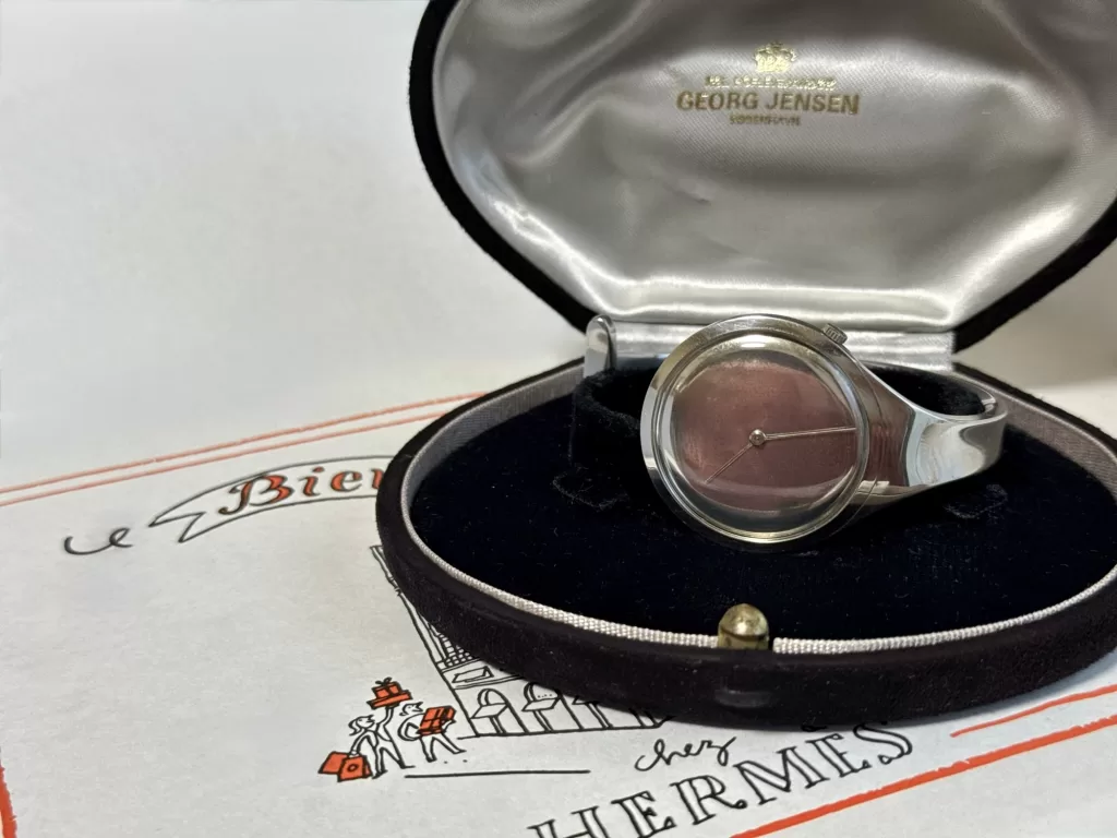 ヴィヴィアンナウォッチは、彼女とジョージジェンセンのコラボレーション作品として1969年に発売されました。腕時計といえば金属やレザーで手首に巻き付ける、昔ながらのスタイルが通常ですが、彼女は自身の哲学をデザインへと昇華させ、初の本格的なバングルウォッチとして1962年に発表しました。